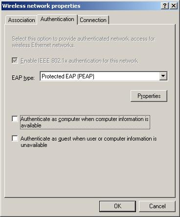 3) Select the Authentication tab. For EAP Type select Protected EAP (PEAP), then uncheck and turn off Authenticate as computer when computer information is available.
