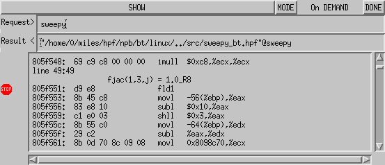 Control Panel - The items in the control panel allow selection of what memory is to be disassembled, and whether the display is to be updated automatically or on demand. A region other than the current function can be displayed by placing a function name or address range in the request field and clicking the SHOW button. The mode selection controls whether the display is updated for each new location, or whether the display is only updated on demand.