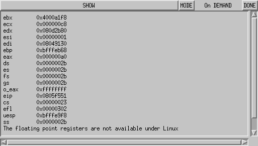 The register window displays the value of the processor's registers. It is invoked by selecting REGISTER in the main window's Window pulldown menu.