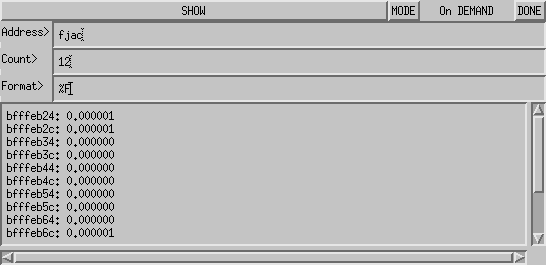 Control Panel - The Address, Count, and Format fields correspond to the 3 arguments to the pgdbg dump command. They specify the start address, repeat count, and dump format. The display is updated each time the SHOW button is clicked. The mode item controls whether the display is updated automatically for each new location or on demand. The default is on demand.