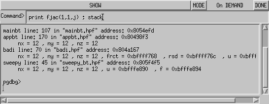 There are two command modes: pgi and dbx. The pgi command mode maintains the original PGDBG command interface. In dbx mode, the debugger uses commands with a syntax compatible with the familiar dbx debugger. Both command sets are available in both command modes, however some commands have a slightly different syntax depending on the mode. The pgienv command allows you to change modes while running the debugger.
